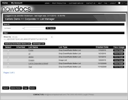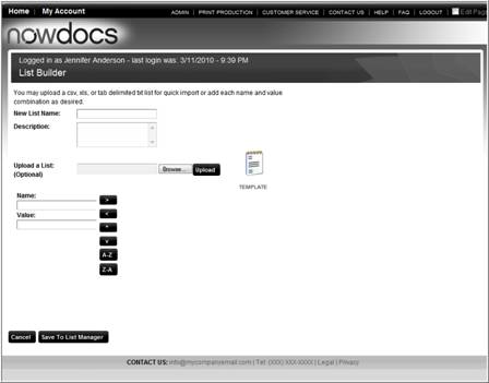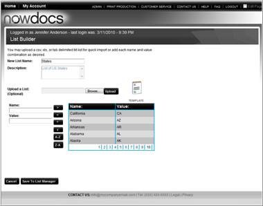 Account Administrators can create and save lists that can be reused in the web forms for drop down lists, radio button lists, and images. This provides the ability for an admin to create commonly used lists only once and reuse it on many web form fields and products. It also allows the ability to upload the list via a data file and zip file (images) for quick setup.