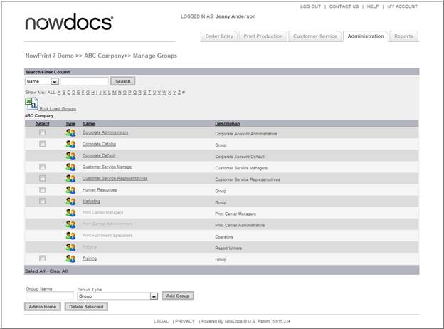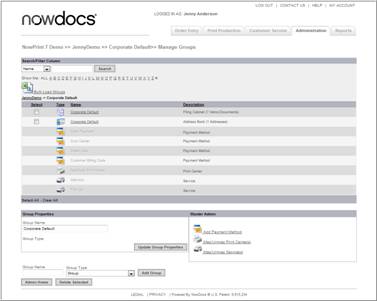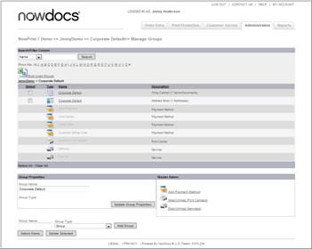 Within a Corporate Account, you can create an unlimited number of groups in order to further segment your users. Groups are a collection of users who share the same settings and offerings within NowPrint. Each group has its own unique file cabinet (catalog) and address book. Each group can be mapped (associated) to delivery services, print centers, and payment methods. Thus, each group can have a unique set of delivery services, print centers, and payment methods available to the users who belong to the group.