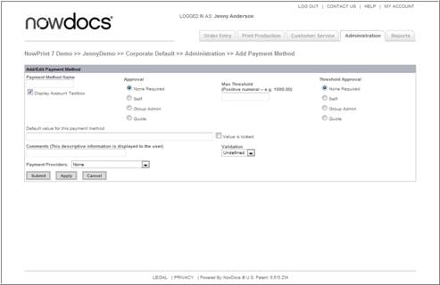 With a Max Threshold value entered and an approver type selected, if an order using this payment method has its order total value over the specified max threshold, the order will be held for approval before it can appear in the print production queue. If more than one approver are assigned (e.g. more than one group approver when Group Admin is selected), only one approver needs to approve the order.